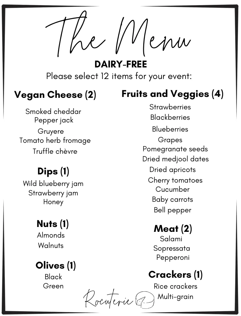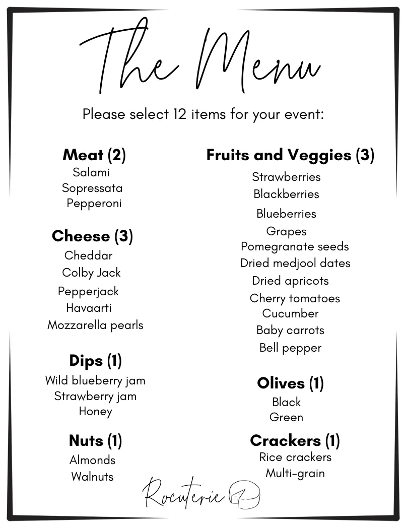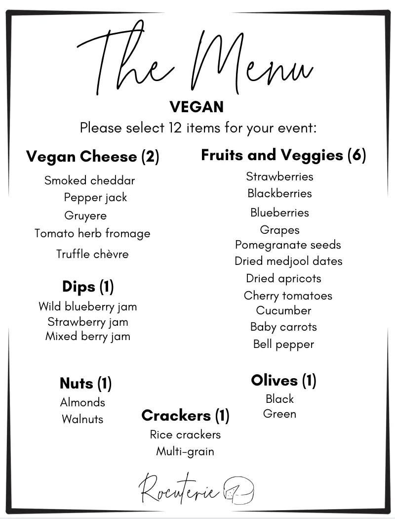 These are sample menus for the ingredients that are available on our charcuterie cart for private events. Menu ingredients are subject to change based on availability, and we can customize ingredients as needed.